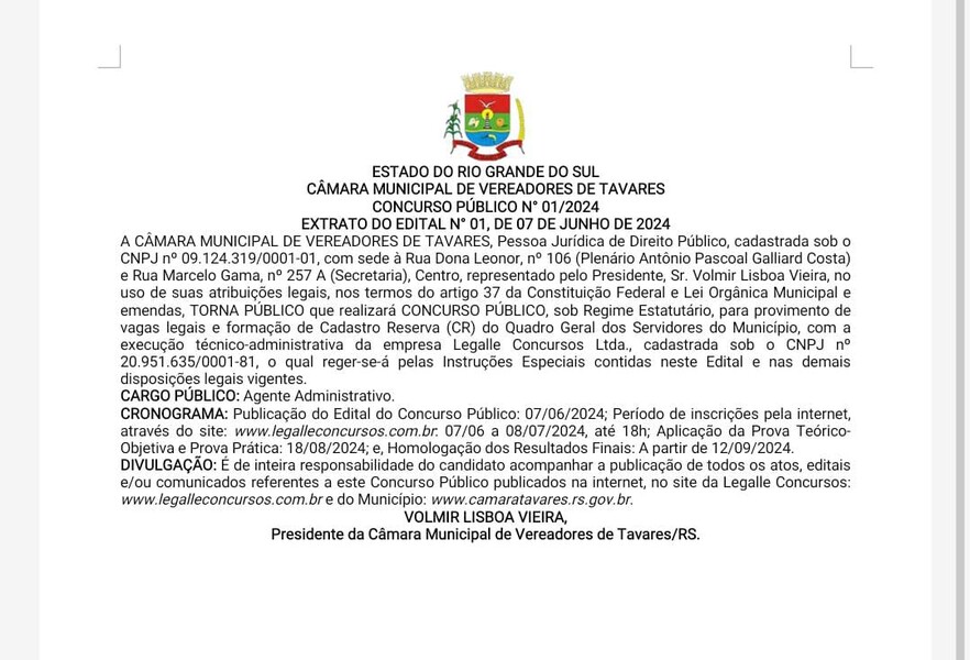 A CÂMARA MUNICIPAL DE VEREADORES DE TAVARES, Pessoa Jurídica de Direito Público, cadastrada sob o CNPJ nº 09.124.319/0001-01, com sede à Rua Dona Leonor, nº 106 (Plenário Antônio Pascoal Galliard Costa) e Rua Marcelo Gama, nº 257 A (Secretaria), Centro, representado pelo Presidente, Sr. Volmir Lisboa Vieira, no uso de suas atribuições legais, nos termos do artigo 37 da Constituição Federal e Lei Orgânica Municipal e emendas, TORNA PÚBLICO que realizará CONCURSO PÚBLICO, sob Regime Estatutário, para provimento de vagas legais e formação de Cadastro Reserva (CR) do Quadro Geral dos Servidores do Município, com a execução técnico-administrativa da empresa Legalle Concursos Ltda., cadastrada sob o CNPJ nº 20.951.635/0001-81, o qual reger-se-á pelas Instruções Especiais contidas neste Edital e nas demais disposições legais vigentes.
