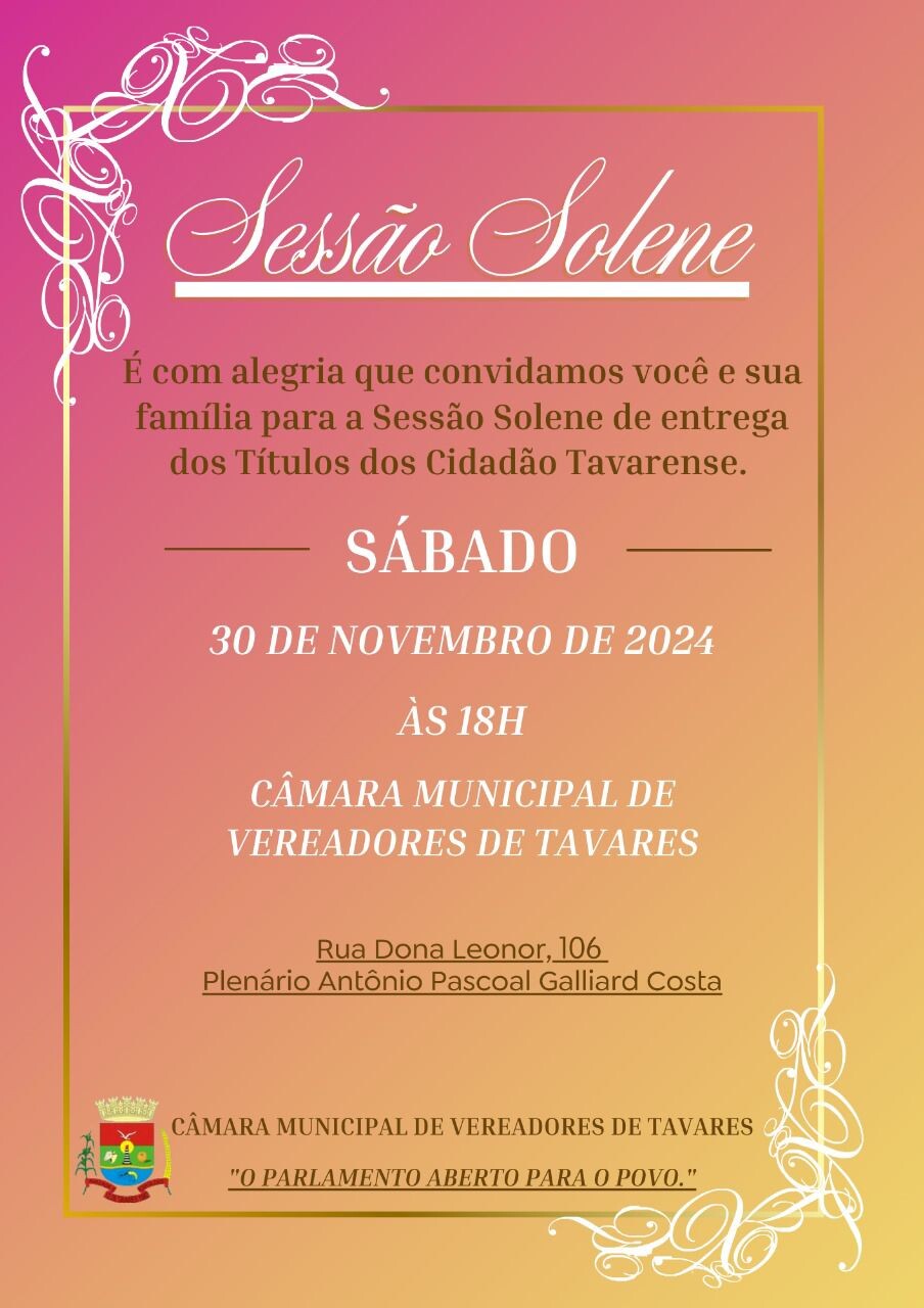 A Câmara Municipal de Vereadores de Tavares realizará uma Sessão Solene no dia 30 de novembro de 2024, às 18h, para a entrega dos Títulos de Cidadão Tavarense. O evento visa reconhecer e homenagear cidadãos que contribuíram significativamente para o desenvolvimento e progresso da cidade. A cerimônia será realizada no Plenário Antônio Pascoal Galliard Costa, na sede da Câmara Municipal, e é aberta ao público. Esta é uma oportunidade de celebrar o compromisso e a dedicação de pessoas que fazem a diferença na comunidade de Tavares.