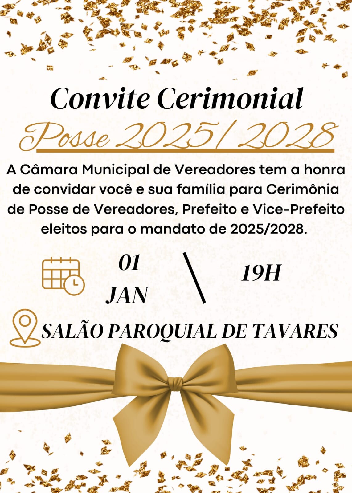 A Câmara Municipal de Vereadores tem a imensa honra de convidar você e sua família para um momento histórico e de grande importância para o nosso município. No dia 1º de janeiro de 2025, acontecerá a Cerimônia de Posse dos novos Vereadores, Prefeito e Vice-Prefeito eleitos, que darão início ao mandato que se estenderá até 2028.